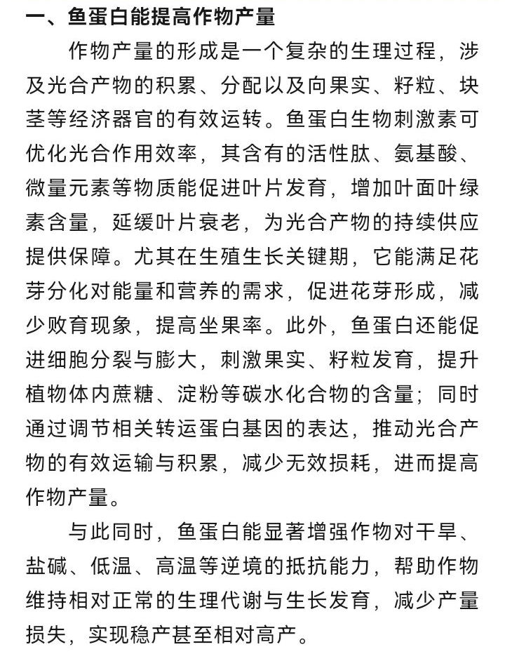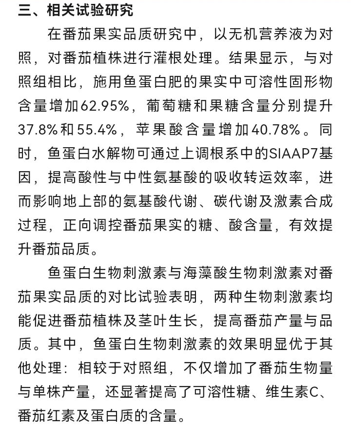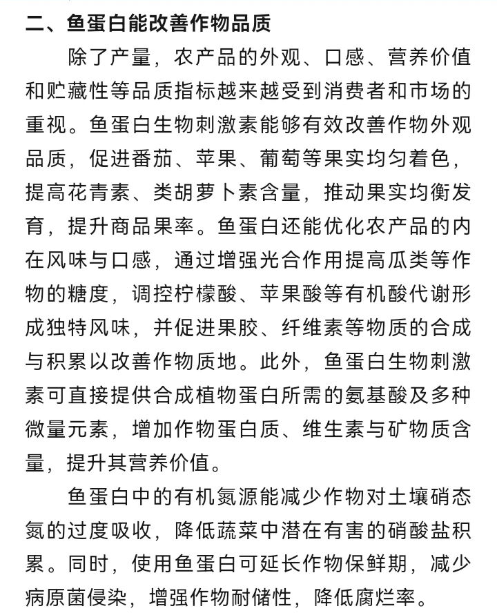 魚蛋白生物刺激素:助力作物產(chǎn)量與品質(zhì)實(shí)現(xiàn)雙重提升發(fā)表時(shí)間:2026-03-13 15:18 魚蛋白生物刺激素作為綠色農(nóng)業(yè)與生態(tài)農(nóng)業(yè)的理想選擇,已成為現(xiàn)代農(nóng)業(yè)領(lǐng)域備受關(guān)注的功能性肥料。憑借獨(dú)特的成分組合與作用機(jī)制,魚蛋白不僅能有效提升作物產(chǎn)量,還可顯著改善農(nóng)產(chǎn)品品質(zhì),充分滿足消費(fèi)者對安全優(yōu)質(zhì)農(nóng)產(chǎn)品的需求。 ![]() ![]() ![]() ![]() ![]() ![]() ![]() ![]() ![]() ![]() ![]() ![]() 電話:0769—83981839 13669811777 微信公眾號:林氏魚肽 |